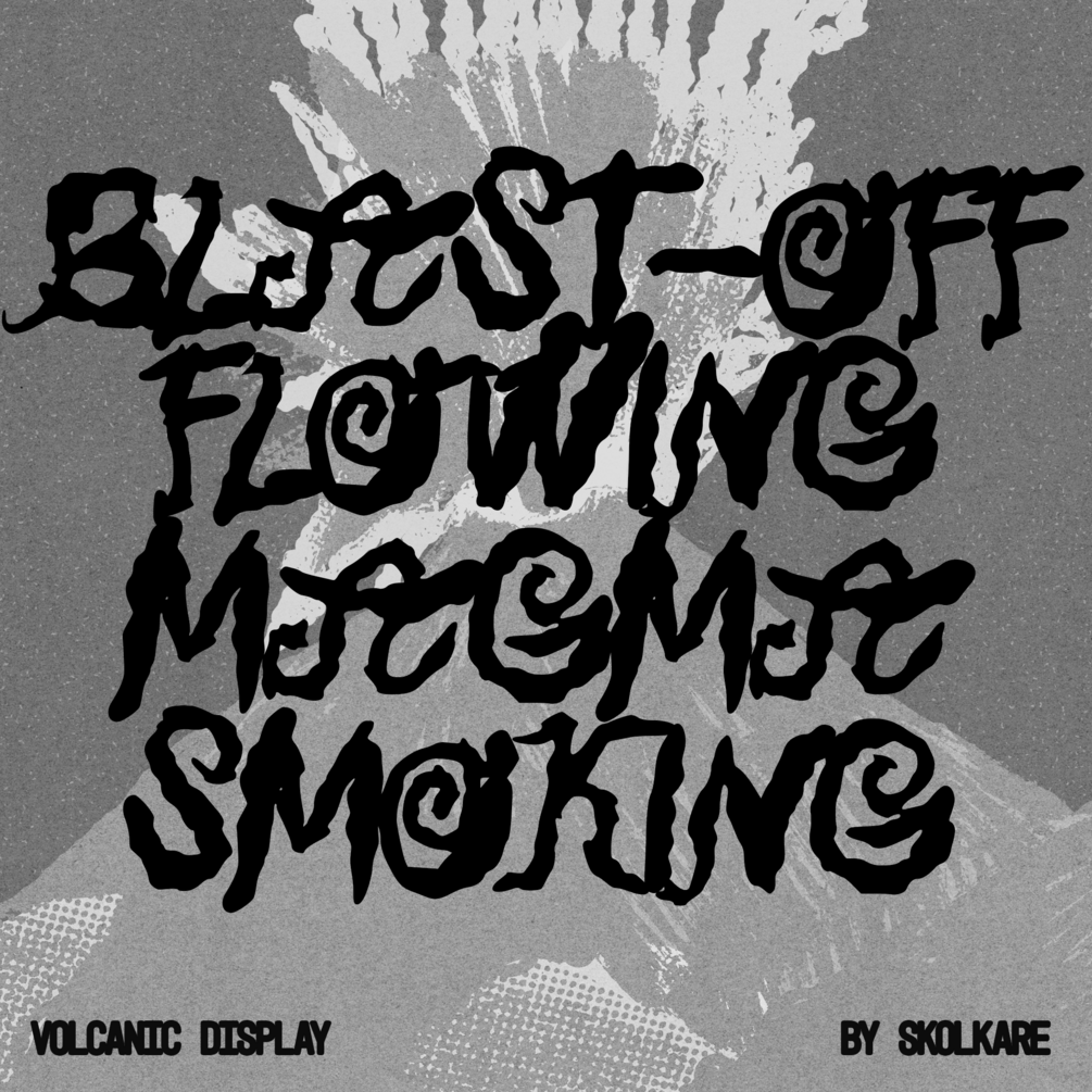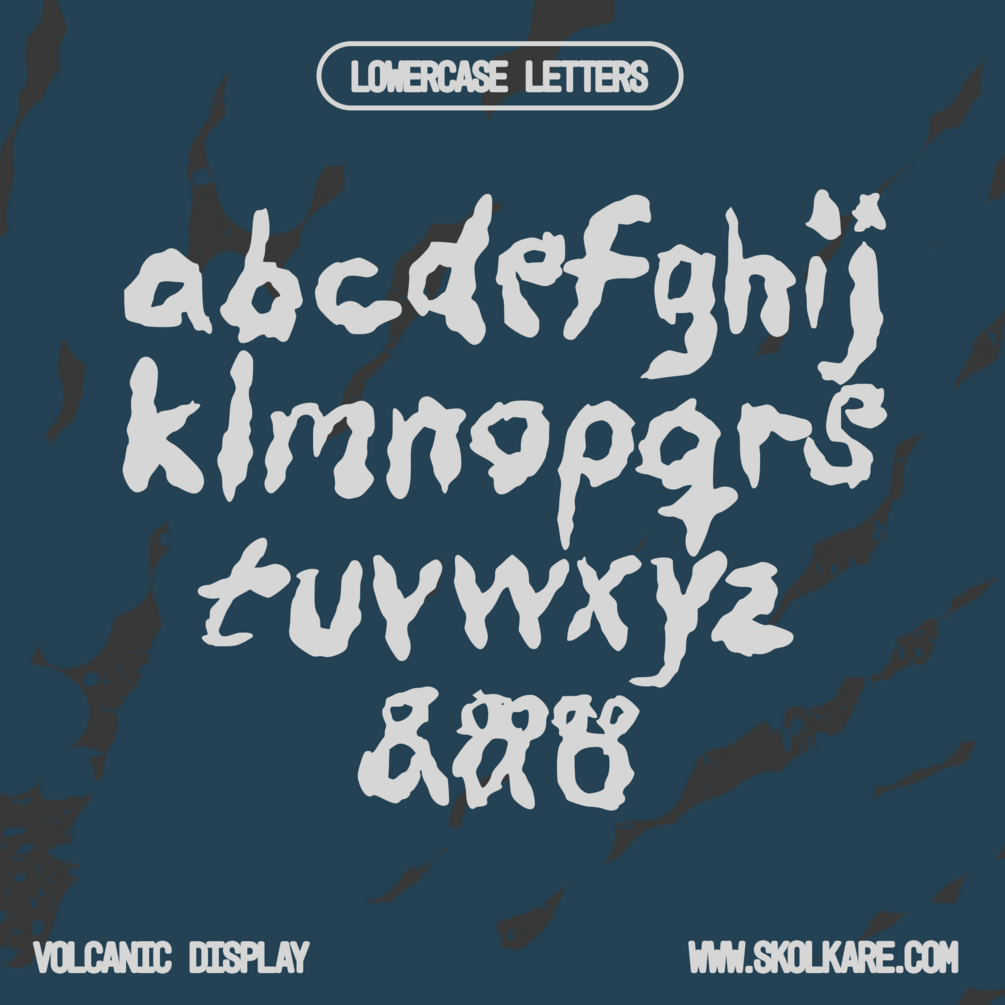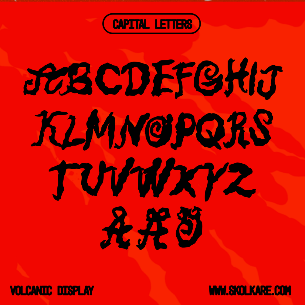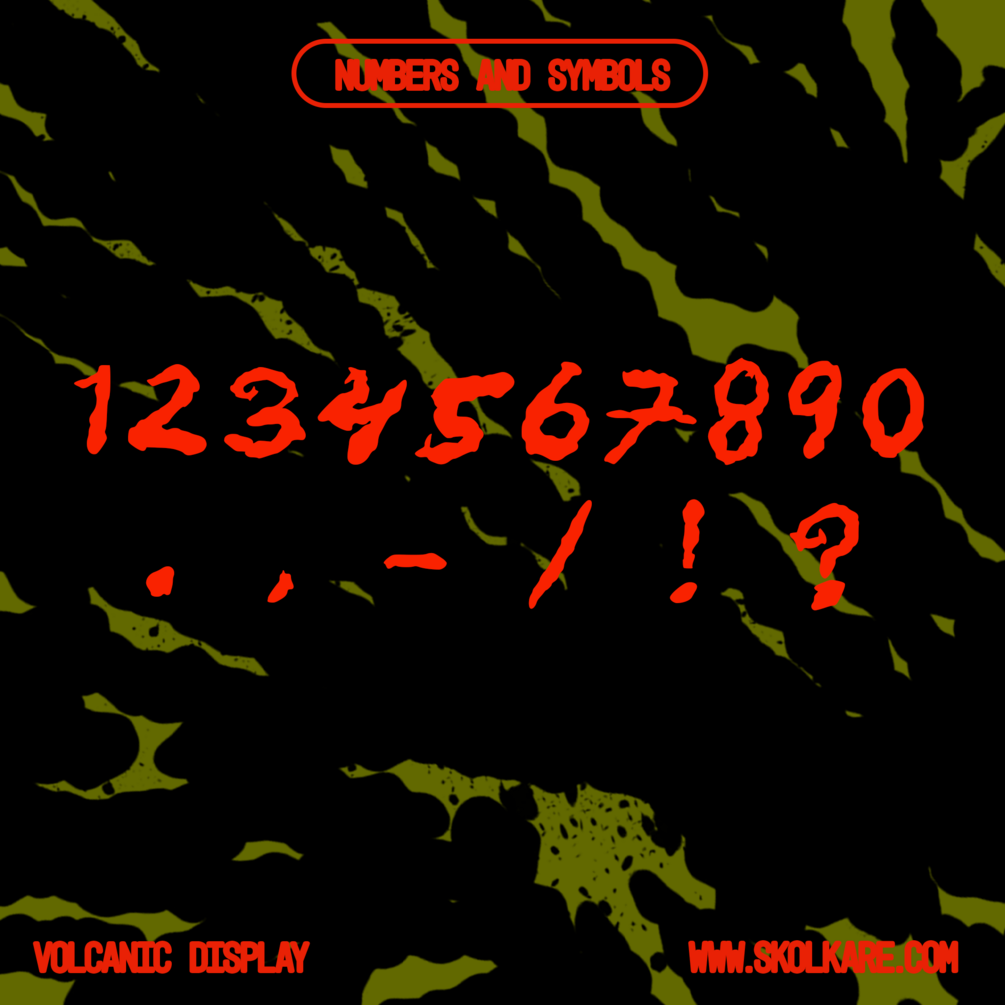 VOLCANIC is a grunge-style, hand-drawn, inky typeface that includes a complete set of upper and lower case letters, numbers (0-9), and basic symbols.